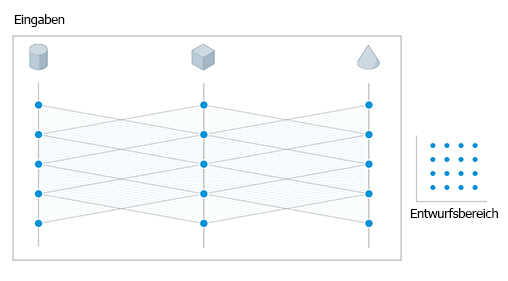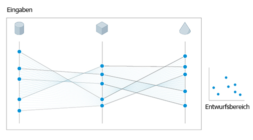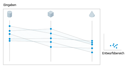 Generatives Design erzeugt Ergebnisse basierend auf den vom Studientyp definierten Abhängigkeiten, wobei zufällige Werte für die angegebenen Variablen innerhalb der definierten Bereiche verwendet werden. Das Ergebnis ist eine breite Palette möglicher Lösungen, die ein zufälliges Sampling variabler Werte darstellen.