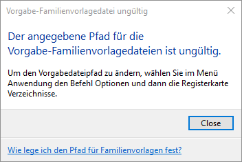 Achtung: Wenn Sie wesentliche Inhaltspakete entfernen, zeigt Revit möglicherweise die folgende Meldung an, da im Familienvorlagenpfad in der Revit.ini keine Familienvorlagen gefunden wurden.