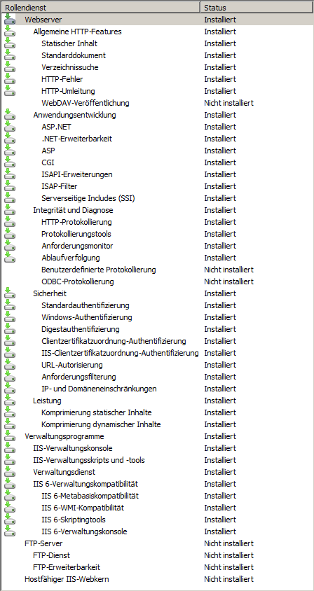 - Führen Sie einen Bildlauf nach unten bis zum Eintrag Rollendienste durch, und vergewissern Sie sich dass die folgenden Rollendienste installiert wurden: