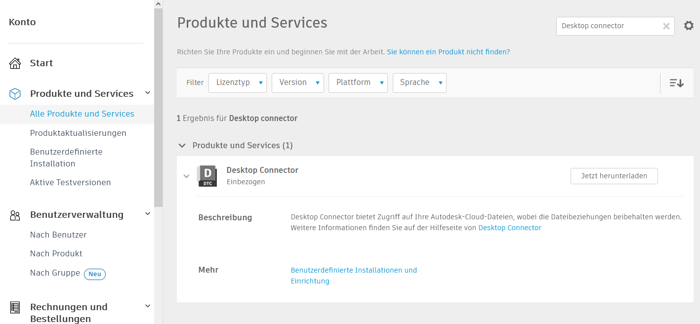 Um die neueste Version herunterzuladen, wechseln Sie zu Produkte und Services in Autodesk Account. Desktop Connector wird unter Produkte und Services angezeigt.