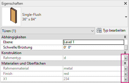 Wenn ein Schlüssel einem Element zugewiesen wird, werden die durch den Schlüssel zugewiesenen Eigenschaften in der Eigenschaftenpalette schreibgeschützt. Parameterwerte, die am Schlüsselwert ausgerichtet sind, zeigen ein "=" rechts neben dem Wert an. Parameterwerte, die nicht am Schlüsselwert ausgerichtet werden können, zeigen einen "≠" an.