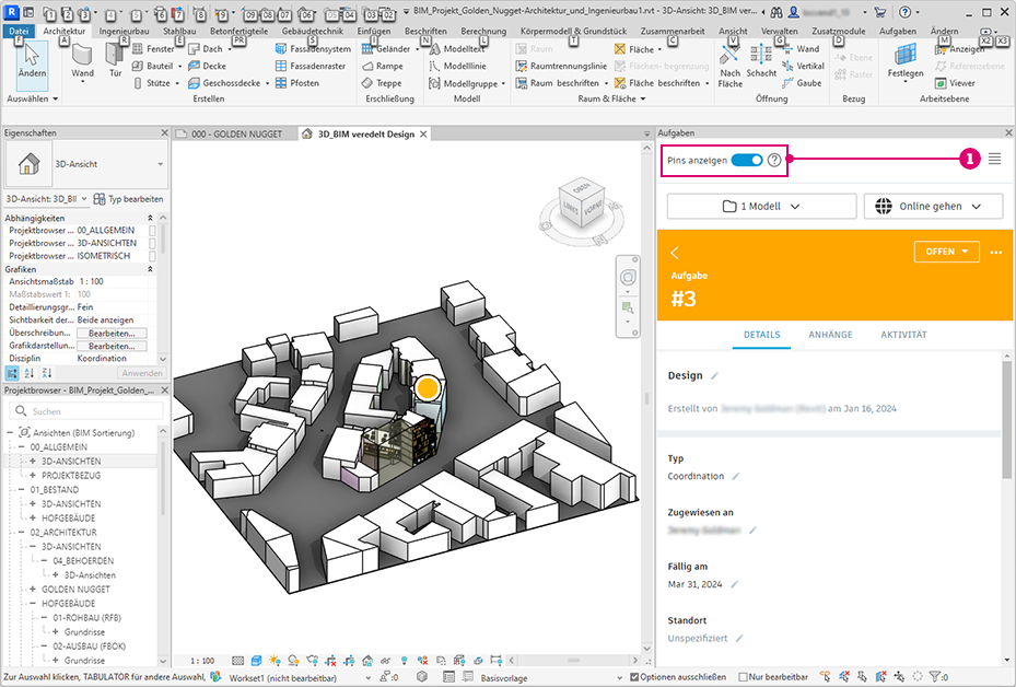 Wenn Sie mit dem Revit-Zusatzmodul Aufgaben arbeiten, wählen Sie Pins anzeigen