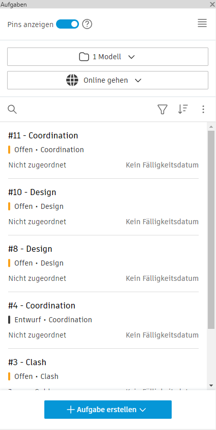 Die neue Aufgabe kann in Docs, Build, Model Coordination und Design Collaboration angezeigt und bearbeitet werden. Klicken Sie auf die Schaltfläche im Menü Aufgabe oder auf die Schaltfläche