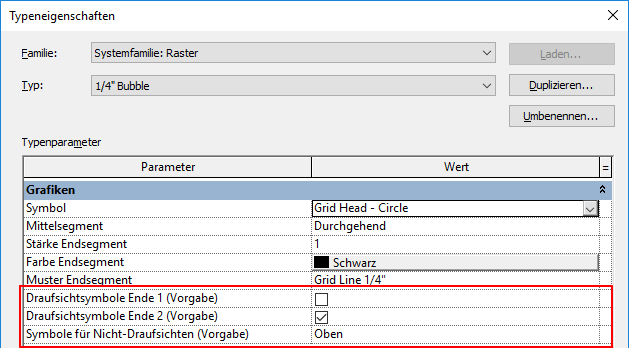 Dies kann für eine einzelne Linie einer Ansicht grafisch erfolgen oder für alle Rasterlinien eines bestimmten Typs durch Änderung der Typeneigenschaften.