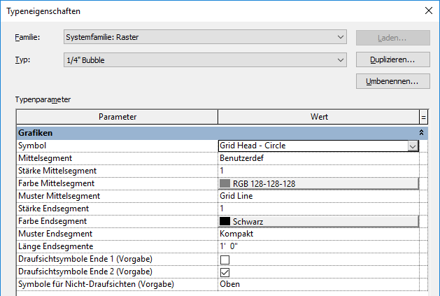Um diese Anpassungen vornehmen zu können, ändern Sie einen Rastertyp. In den Ansichten werden die Änderungen für alle Rasterlinien dieses Typs übernommen.