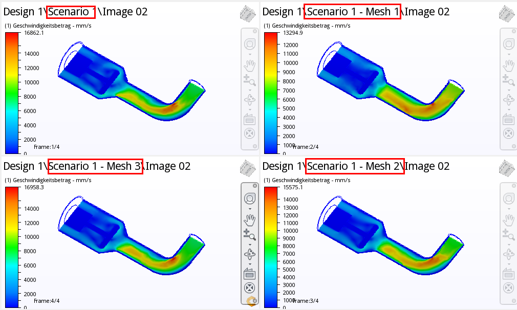 In diesem Schritt führen Sie keine Animationen zwischen Szenarien durch, sondern verwenden mehrere Ansichtsfenster, um die Geschwindigkeitsfelder nebeneinander zu vergleichen.