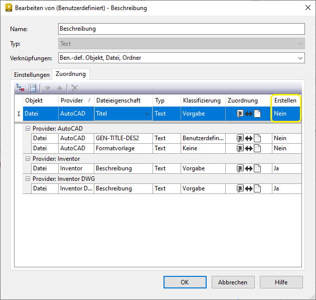 Nachdem Sie die Schriftfeldnamen in Vault aktiviert haben, ordnen Sie die AutoCAD Mechanical-Stücklisteneigenschaften Vault-Eigenschaften zu.