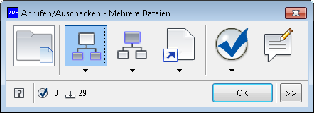 Beim Herunterladen oder Auschecken einer Datei können Sie angeben, ob zugehörige Dateien ebenfalls heruntergeladen oder ausgecheckt werden. Das VDF unterstützt die Relationserfassung zur Einbeziehung von untergeordneten Relationen, übergeordneten Relationen oder mittels Verknüpfungen zugeordneter Dateien.