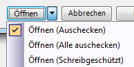 Der Aktionsschaltflächentext kann angepasst werden (z. B. Öffnen, Speichern usw.). Zusätzlich können der Aktionsschaltfläche Optionen zugeordnet werden, die als Dropdown-Menü angezeigt werden. Beispielsweise könnten Sie der Schaltfläche Öffnen ein Dropdown-Menü mit den Optionen Öffnen (Auschecken), Öffnen (Alle auschecken) und Öffnen (schreibgeschützt) zuordnen. ![]() |