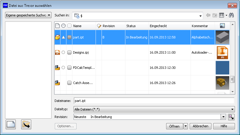 Die Option Vorzug für freigegebene Dateiversionen ist ein Ein/Aus-Schalter, der in das Dialogfeld eingefügt werden kann, um anzugeben, ob beim Auswählen eines Objekts aus dem Tresor freigegebene Daten den Vorzug vor nicht freigegebenen Daten erhalten sollen. Wenn sich z. B. zwei Revisionen einer Datei im Tresor befinden, von denen eine den Status Freigegeben hat, wird automatisch die freigegebene Revision ausgewählt. Der Ein/Aus-Schalter Vorzug für freigegebene Dateiversionen kann so konfiguriert werden, dass vorgabemäßig freigegebene oder nicht freigegebene Revisionen ausgewählt werden. |