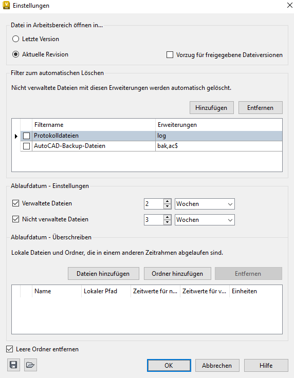Die Ablaufeinstellungen gelten für alle verwalteten und nicht verwalteten Dateien im lokalen Arbeitsbereich. Für bestimmte Dateien und Ordner können Ablaufüberschreibungen festgelegt werden, um spezifischere Kriterien einzustellen.