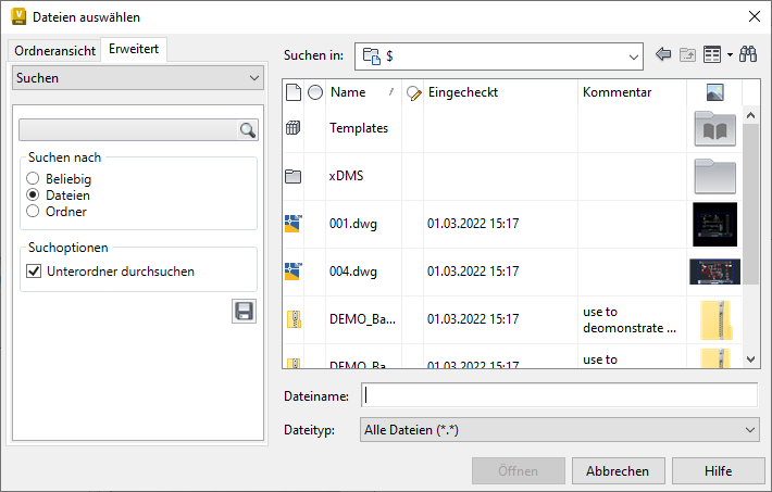 Im Dialogfeld Datei auswählen können Sie eine Datei aus dem Tresor viel einfacher auswählen, indem Sie die erweiterte Suche, Verknüpfungen und gespeicherte Suchvorgänge verwenden. Das Dialogfeld Datei wählen steht in verschiedenen Arbeitsabläufen in Vault Client zur Verfügung (Copy Design, Anhänge, Bereinigen, Umbenennen, Ersetzen, Artikel, Plot-Manager usw.). Es wird außerdem zur Bearbeitung in CAD (Inventor, AutoCAD) geöffnet.