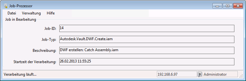 Der Job-Prozessor ist eine eigene Anwendung, die in die Warteschleife gestellte Jobs reserviert und diese zur Verarbeitung vom Job-Server abruft. Da der Job-Prozessor zusammen mit dem Vault-Client installiert wird, kann jede Arbeitsstation mit einer Autodesk Vault-Edition zum Publizieren von Jobs verwendet werden.