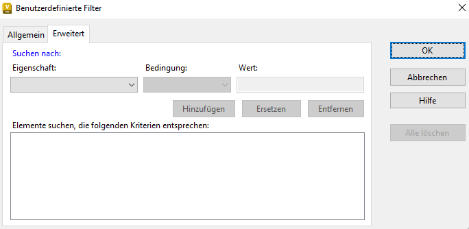 - Wählen Sie im Dialogfeld Benutzerdefinierte Filter die Registerkarte Erweitert und dann eine Eigenschaft aus, nach der gefiltert werden soll.