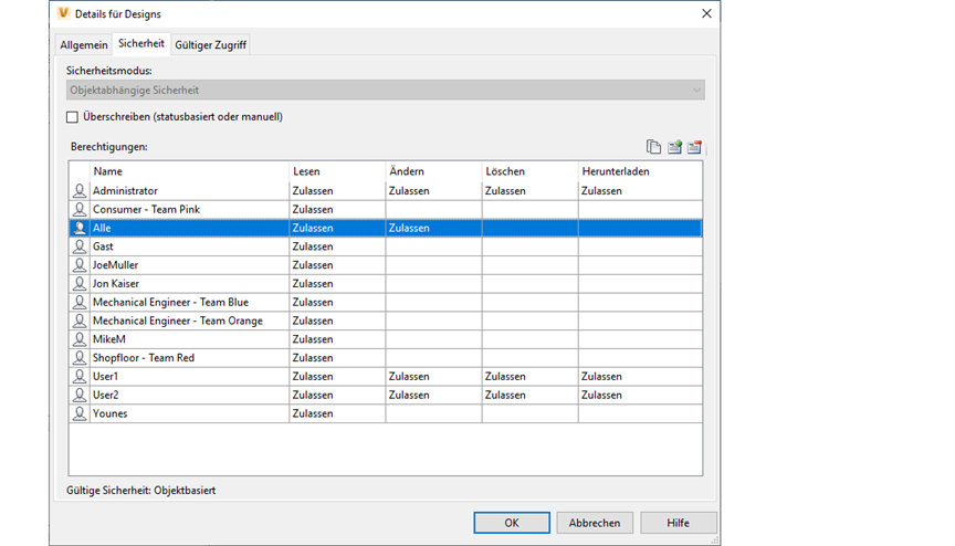 Die Objekt- und Lebenszyklusstatus-basierte Sicherheit und benutzerdefinierte Rollen umfassen jetzt eine Download-Berechtigung. Bisher konnte jeder Benutzer oder jede Gruppe mit Leseberechtigung die Datei herunterladen. Es ist jetzt möglich, bestimmten Benutzern Zugriff zu gewähren, um den Ordnerinhalt anzuzeigen, auf Dateieigenschaften und die Registerkarten Verwendung/Wiederverwendung zuzugreifen und gleichzeitig zu verhindern, dass sie die eigentlichen Dateien herunterladen können. Benutzer mit Leseberechtigung für eine Datei können nur Vorgänge nicht verwenden, für die Berechtigungen zum Herunterladen von Dateien erforderlich sind, wie z. B. Konstruktion kopieren, Abrufen, Pack and Go usw.