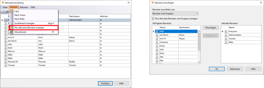 Mithilfe der Option in der Dropdown-Liste Ansicht können Sie deaktivierte Benutzer ein- oder ausblenden.