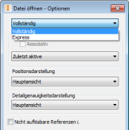 Das Vault 2018-Zusatzmodul für Inventor ermöglicht das Öffnen von Dateien im vollständigen Modus oder im Expressmodus. Wenn Sie die Option Komplett laden verwenden, werden alle Komponentendaten geladen, und alle Befehle sind verfügbar. Wenn Sie die Option Express laden verwenden, werden Dateien bei großen Baugruppen wesentlich schneller geöffnet (3-5x), aber einige Befehle stehen nicht zur Verfügung.