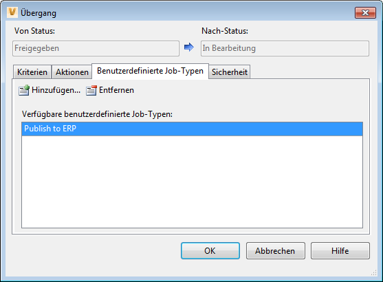 Vault-Administratoren können Statusübergängen jetzt benutzerdefinierte Jobs direkt im Dialogfeld Tresoreinstellungen zuweisen. Beim Definieren von neuen oder vorhandenen Status können Vault-Administratoren den Statusübergang bearbeiten und die neue Registerkarte Benutzerdefinierte Job-Typen verwenden, um einen benutzerdefinierten Job anzugeben.