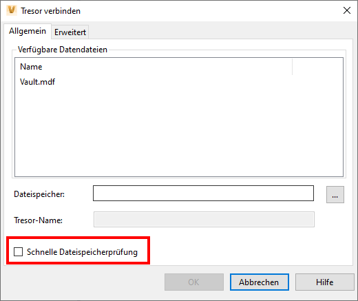 Es wurde eine neue Option hinzugefügt, um die schnelle Überprüfung von Dateien beim Verbinden eines Tresors in ADMS Console zu ermöglichen. Wenn ein Tresor verbunden ist oder eine Sicherungskopie wiederhergestellt wird, führt der Prozess eine Dateispeicherprüfung durch, bei der die Prüfsumme in Vault für die Dateien im Dateispeicher überprüft wird. Für umfangreiche Einrichtungen auf Unternehmensebene kann der Validierungsschritt extrem lange dauern. Mit dieser neuen Option können Sie prüfen, ob die Datei vorhanden ist, ohne die Prüfsumme zu berücksichtigen, wodurch die Validierung und die Verarbeitung beschleunigt werden.
