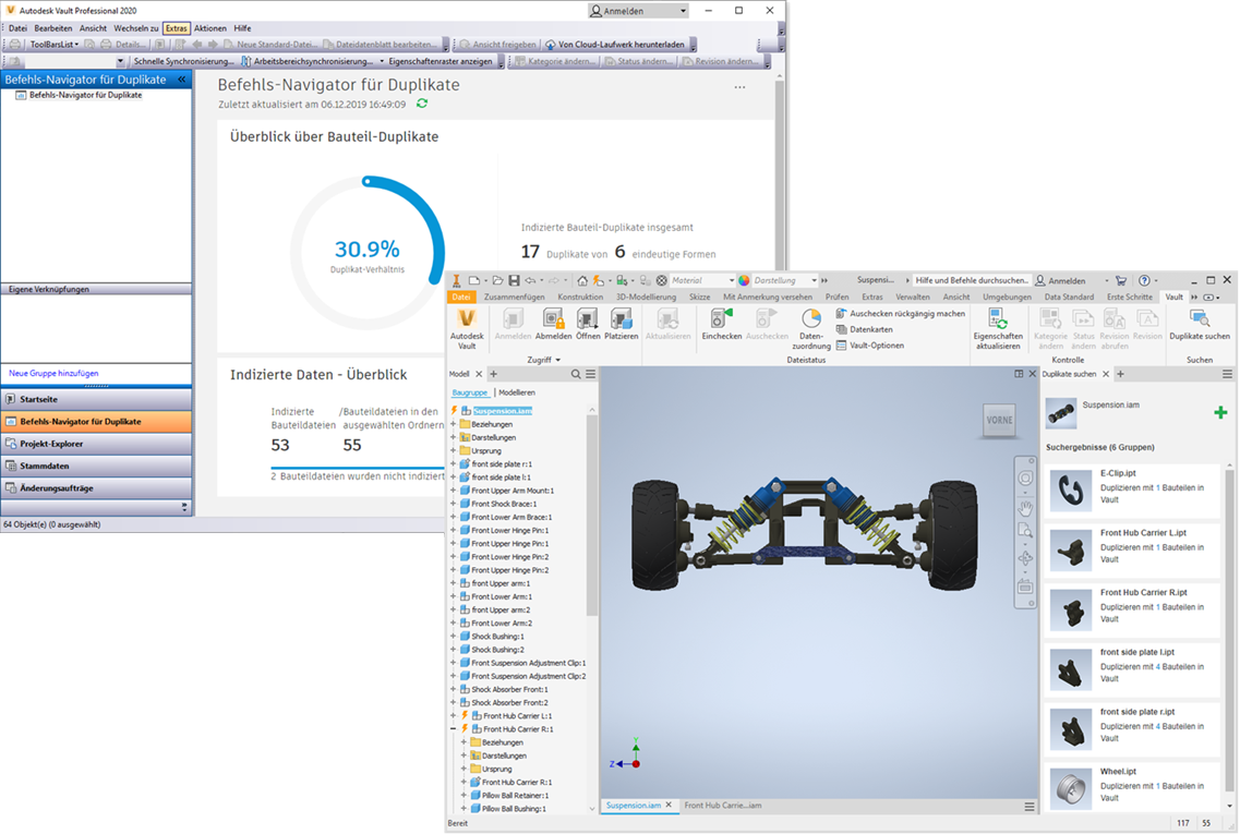 Wir stellen eine Reihe neuer Funktionen bereit, mit denen Sie vermeiden können, dass Sie Bauteil-Duplikate in Ihren Konstruktionen verwenden. Die Duplikatsuche ermöglicht es Ihnen, Daten intelligent und schnell zu unterscheiden. Durch den Vergleich von Geometrien in Vault wird die Produktivität und somit auch die Markteinführung erheblich beschleunigt. Die Möglichkeit, in Bearbeitung befindliche Dateien durch vollständig freigegebene Komponenten zu ersetzen, wirkt sich direkt auf die Qualität Ihrer Produkte und die Rentabilität Ihres Unternehmens aus.