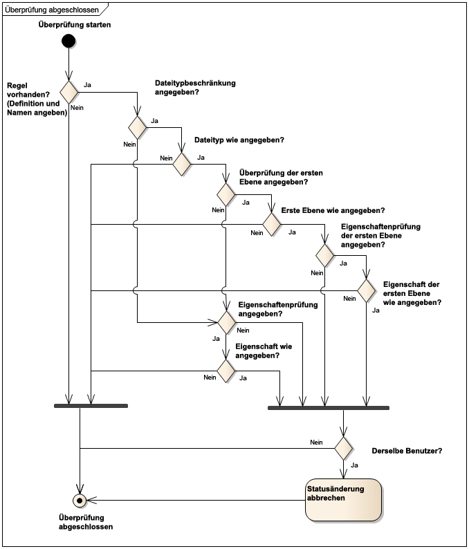 Die Prüfung wird während einer Statusänderung eines Dokuments durchgeführt. Dabei wird geprüft, ob der aktuelle Benutzer der gleiche Benutzer ist, der die vorherige Statusänderung durchgeführt hat. Die Prüfung besteht aus zwei Teilen: Vorüberprüfung und Benutzerprüfung.