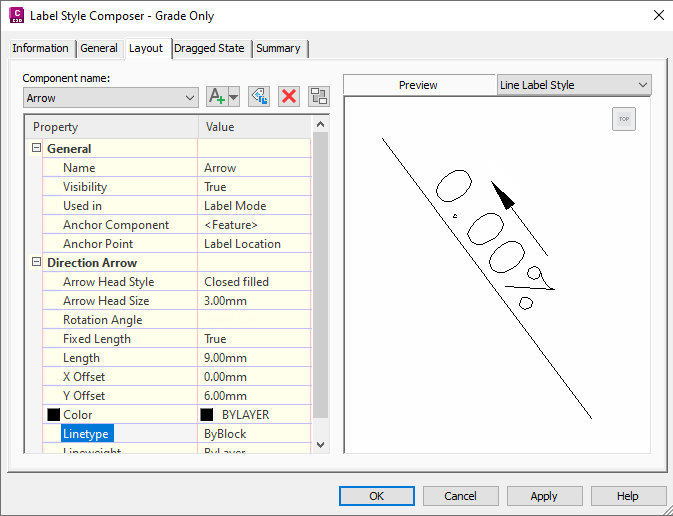 The default Gradient Only label style displays the gradient using a direction arrow that points in the forward direction of the feature line.