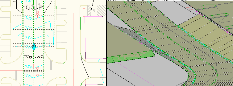 The design shown in figure 31 consists of a combination of corridors, feature lines, and gradings. Using the targeting methods discussed previously, these different components are actually tied together. In this example, if the profile for this corridor is adjusted, not only does the corridor design adjust, but also the relationship between it and the adjacent site grading is maintained.