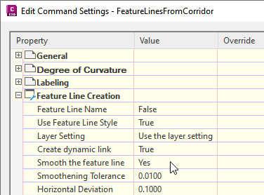 Figure 4: Command setting to smooth corridor feature lines for grading