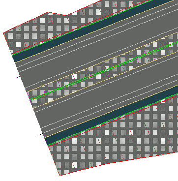 Applying hatching to a corridor requires that you apply a material area fill style to each of the appropriate subassembly links. Hatching produces a less realistic image of the surface than rendering, but hatching prints easily through AutoCAD.