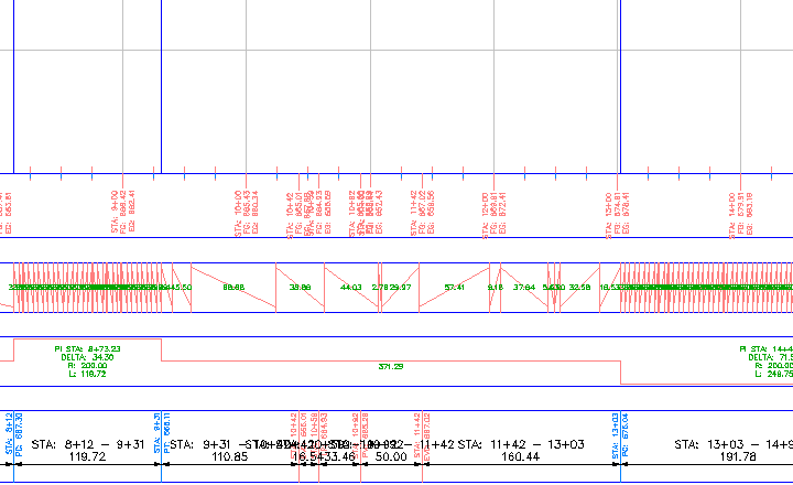 The horizontal geometry band is added to the bottom of the profile view in the drawing. This data box is drawn in a different style from the one along the top of the grid. However, both styles show the location of horizontal curves and are labeled with basic engineering data about the curves. These bands are useful for evaluating the design profile from a drainage and safety point-of-view.