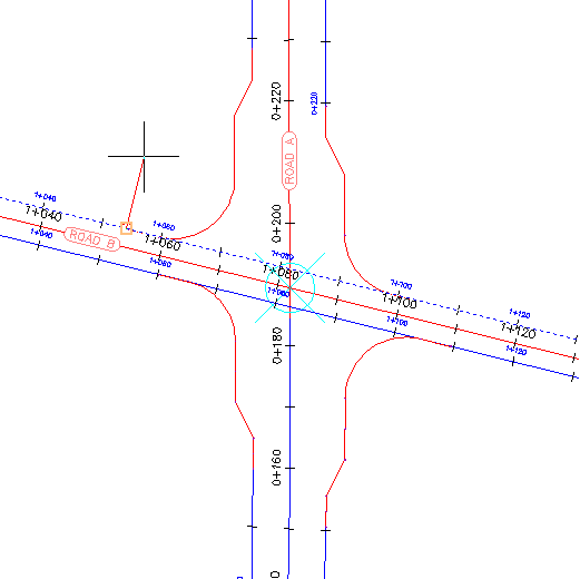 The drawing contains a four-way junction. Notice that the offset alignments along Road A are not displayed in the junction area. Each of these alignments has a mask applied to the region that passes through the junction. In the following steps, you will apply a mask to the offset alignments along Road B.
