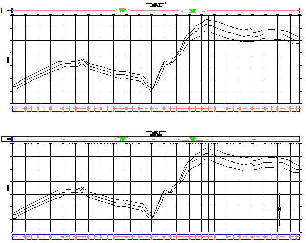 The Left Offset profile changes to red (reflecting the Existing Ground style) in profile view PV - (1), but not in PV - (2). The left offset profiles are different because you overrode the profile style for the particular profile view, but did not change the profile style. You can use a style override to preserve the profile style within a profile view, protecting it from later style changes.