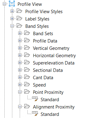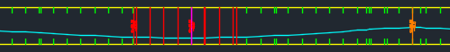 The following illustration shows an alignment proximity band. It shows the distance between an alignment and the parent alignment and uses red ticks to show alignment segments within the alert distance: