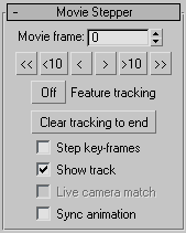 The Camera Tracker utility's Movie Stepper rollout browses through the movie during the tracking phase either to set start and stop frames, to review tracking results or to manually perform a track over a sequence of frames. The Movie Stepper rollout consists of a frame counter, a set of stepper buttons, and some option checkboxes.