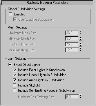 In order to create the lighting of a scene, 3ds Max calculates the intensity for discrete points in the environment by subdividing the original surfaces into elements which are part of a radiosity mesh. This rollout allows you to determine whether you want a mesh or not, and to specify the size of the mesh elements in world units. For quick tests, you might want to turn off the mesh globally. The scene will look flat, but the solution will still give you a quick impression of the overall brightness.