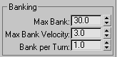 - The number of degrees the delegate will bank as a function of the turn angle at the current frame. For example, if Bank Per Turn=1, the delegate will bank one degree for every degree it is turning at a given frame. Default=1.0.