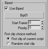 - First clip of current script Uses the first clip in the biped's motion flow script, if a script exists. If this option is chosen, but there is no script, an error message is generated.
