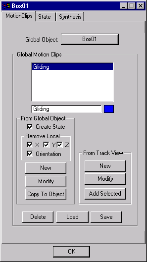 You can use this function in several ways. First, if you've changed the animation on the Global Object, you can restore it from a stored motion clip with Copy To Object. Also, if you've edited the clip in Track View (Global Tracks