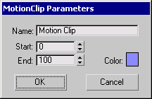 Enter a clip name, frame range, and color using controls in the MotionClip Parameters dialog. character studio determines which clips to trigger by states that you define on the State panel.