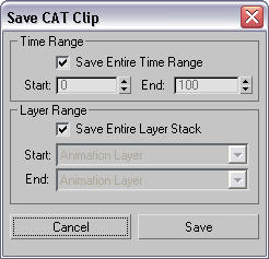 Saves one or more layers as a clip. Clicking the button opens a file dialog where you can specify the name and location of the clip; when you click Save, the Save CAT Clip dialog opens.