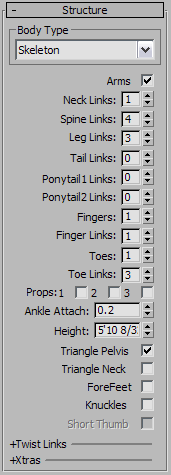 When Figure mode is active, the Structure rollout becomes available. This rollout includes parameters for changing the biped’s skeletal structure to match your character mesh (dinosaur, robot, human, and so on). You can also add up to three props to represent tools or weapons.
