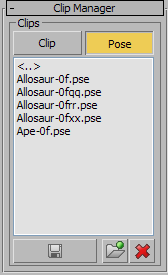 Saves the current pose from the active animation layer. Clicking the button opens a file dialog where you can specify the name and location of the pose file; when you click Save, the pose is saved. If you use the default location, the pose then appears in the pose list.