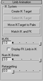 The Limb Animation rollout provides access to the IK and FK settings for the limb.