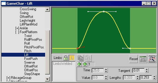 All controllers except for the OffsetRot and OffsetPos have graphs to show the curve for the motion of the selected controller within the motion cycle.