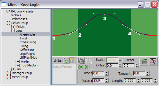 The walk cycle is divided up into four knee angles. Control over the knee angles is accessed in the KneeAngle controller, under Legs in the CATMotion editor.