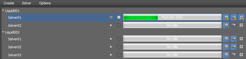 Use the Solver Area to manage liquids and solvers, start and stop solves, monitor sim progress, and select simulation components.