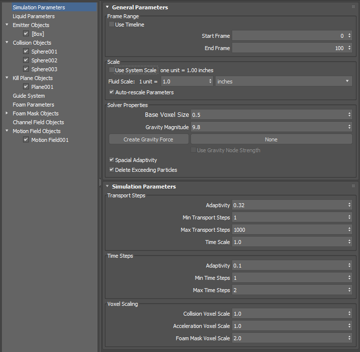 - Sets top-level simulation parameters such as scale, base voxel size, and gravity settings, as well as transport and time steps.