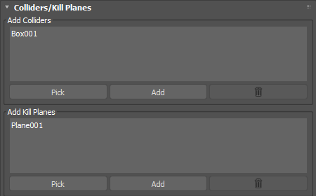 - Click Pick to pick objects from the scene to add as kill planes, or click Add to select kill planes from a dialog. Click Delete to delete an existing selected kill plane.
