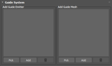 - Click Pick to pick objects from the scene to add as a guide emitter, or click Add to select a guide emitter from a dialog. Click Delete to delete an existing selected guide emitter.