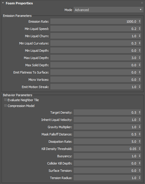 - Sets the amount of surface tension to apply to the foam particles. The attractive force pulling particles together works within the region set by Tension Radius. Use values between 0 and 0.1, and more typically in the 0.01 to 0.02 range. Values higher than 0.1 can cause foam particles to ball together. The effect is most noticeable in small-scale non-turbulent liquids. Foam Surface Tension works best with Compression Model and Evaluate Neighbor Tile turned on.